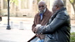 A senior African-American man, in his 80s, arrives with two cups of coffee, hands one to his friend, who is in his 70s, and sits down beside him. They are in a city park.