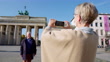 Senior couple traveling to Berlin, taking photos at Brandenburg Gate. Senior woman taking pictures of her husband while on a vacation.