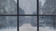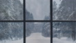 Silhouette eines Holzfensters mit Blick auf den Winterwald. Schöne Winterlandschaft mit fallendem Schnee. - 4K Stock-Video