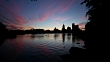 Providence, Rhode Island - July 11, 2016: A pink sunset sky reflects in the calming waters of the Providence River against the silhouette of the city. A tiny flock of Canadian geese feed in the river.