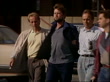MS IRA member Gerard Thomas Hanratty along as each arm held by plain clothes police officer PAN L-R as down slope outside station PULL OUT PAN R-L as along