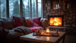 A warm, crackling fireplace takes center stage, casting a cozy glow on the room and creating the perfect ambiance for holiday gatherings.