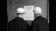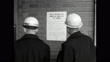 Sequence showing a medium shot of two men wearing hard hats read a poster asking workers to save water before walking off and a close-up of the poster at the Dormon Long steel mill in Middlesborough, UK; 1960. (LGF5313L - AEVZ001J)