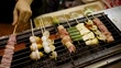 A variety of grilled skewers are cooked at a night market in Bangkok city