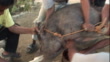 Village men slaughter a pig.