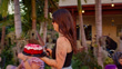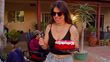 A woman wearing a black tank top and shades brings a red velvet cake to her group of friends at a barbecue party in the evening.