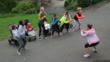 Eine Gruppe von Müttern hockt in einem Fitness-Bootcamp im Park mit ihren Babys in Kinderwagen.